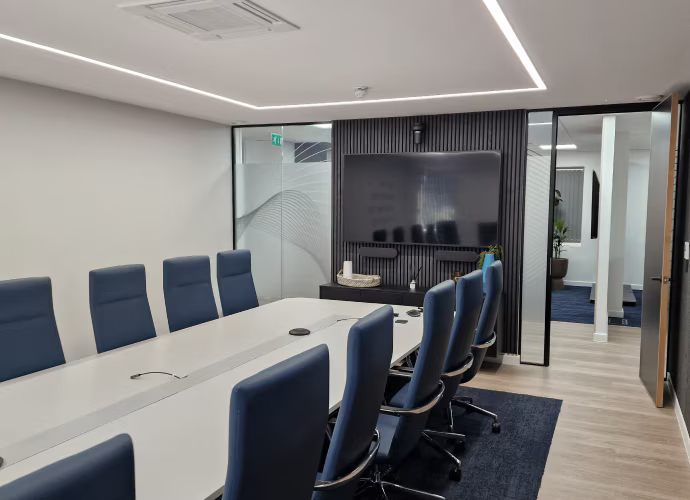 Se utilizan pantallas de 65 pulgadas en el vestíbulo de entrada y en las salas de reuniones pequeñas y medianas. の画面 75 pulgadas proporciona un impresionante punto focal en la sala de juntas, mientras que otra de 85 pulgadas en el área común de la oficina se utiliza para colaborar en equipo y compartir noticias de la empresa.