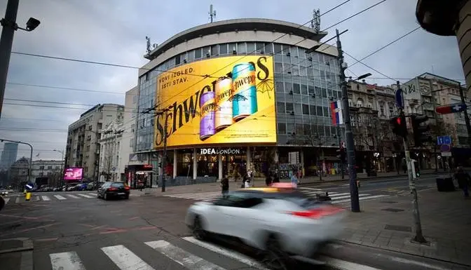 ボグダン・ケキック, DPC 購買および物流ディレクター, 「ビデオスクリーン番号のインストールを待っている間、 200 ベオグラードで, セルビア, Daktronics と DPC は、別の主力ディスプレイを設置する機会を利用しました. この機会に, 新しいタイプの自由形状ファサードビデオスクリーンの世界初の設置, の表面を持つ 322 平方メートル, 新年のお祝いにちょうど間に合うように完成しました. 光沢のある外観, ベオグラードの中心交差点のひとつにあるこのスクリーンの鮮やかな色と大きさは、行き交う人々の注目を集めています。, ドライバーであろうと歩行者であろうと”.