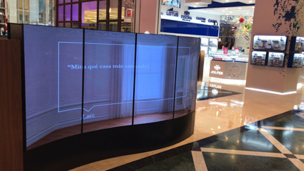 El videowall ‘ola’ OLED, en configuración 4×1 a doble cara, ha sido diseñado a medida con pantallas flexibles (convexas y cóncavas) e instalado dentro del recinto comercial para mostrar contenidos generados a través del software y servidores de Scala.