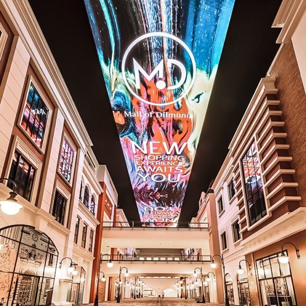 Ubicada en el techo y con unas dimensiones de unos 9 metros de ancho por 60 de largo, la pantalla Led del centro comercial Dilmunia (Mall of Dilmunia) en Baréin aprovecha la tecnología de señalización digital para mejorar la experiencia de los visitantes con imágenes de gran impacto en resolución 8K.