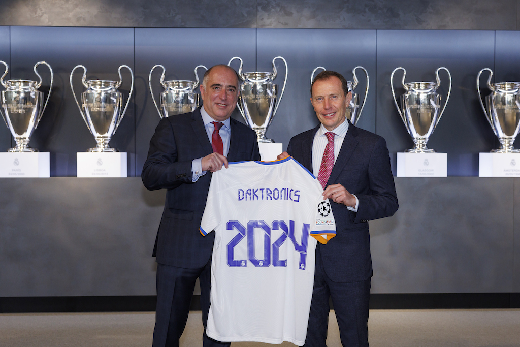 Emilio Butragueño, director de Relaciones Institucionales del Real Madrid, e Iván del Río, gerente regional de Daktronics, han firmado un acuerdo de colaboración global y plurianual, por el que el fabricante convierte en el proveedor del videomarcador de 360º y la fascia de primer anfiteatro que se instalarán en el estadio.