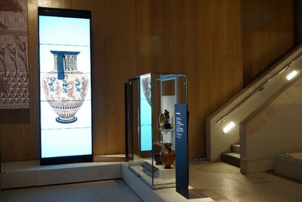 Las vitrinas de los objetos se encuentran situadas frente a las pantallas, que muestran vídeos de alta resolución de los objetos a gran escala para que los visitantes puedan explorar los detalles y están diseñadas para atraer a los visitantes hacia los extremos del museo.