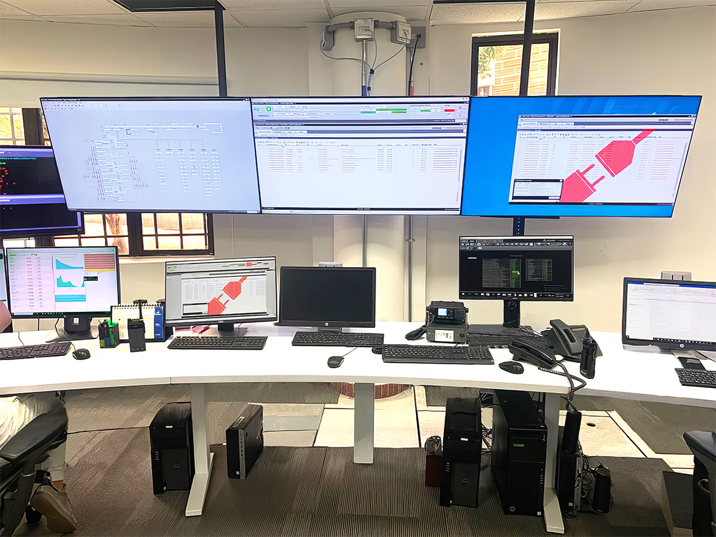 El NOC incluye tres estaciones de trabajo en una distribución de centro de mando y una sala de equipamiento adyacente identificada como sala de crisis. Las estaciones de trabajo se utilizan simultáneamente, cada una con dos salidas HDMI. Las señales son convertidas para su extensión sobre infraestructura de cable CAT 6 al procesador de videowall Quantum Ultra 4K de Extron, que está montado en el rack de la sala de crisis. Las señales se vuelven a convertir a HDMI para su procesamiento.