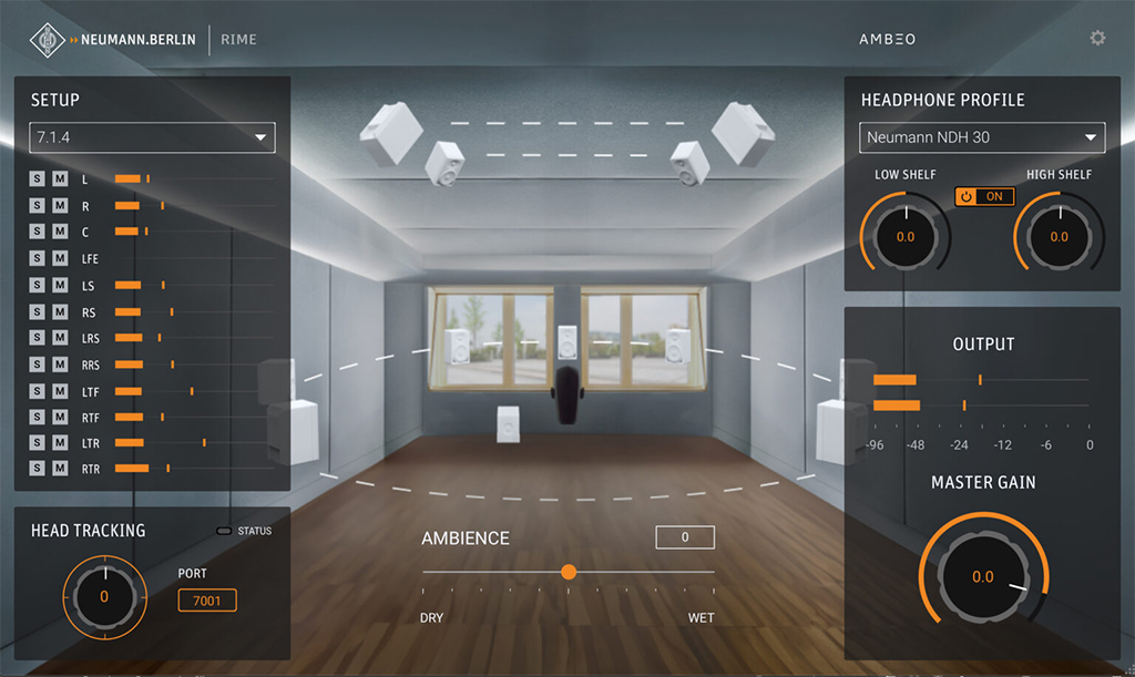 RIME es un complemento DAW (VST3, AU, AAX) que permite a los usuarios monitorizar formatos inmersivos como Dolby Atmos 7.1.4 a través de auriculares mediante los algoritmos Ambeo.