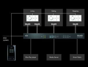 Según el modelo elegido, hay disponibles cuatro u ocho salidas estéreo para altavoces, que pueden situarse en otras tantas estancias. En el caso del modelo de ocho salidas, las dos primeras pueden derivarse a un segundo amplificador para mejorar la calidad de sonido en estancias grandes o simplemente para incrementar el número de cuartos a los que dotar de audio de forma virtualmente ilimitada. En cualquier caso, si ya está instalado un sistema KNX solo se necesita el cableado para los altavoces.