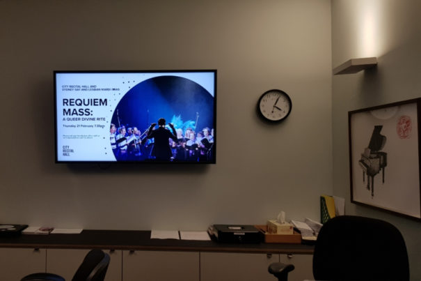 City Recital Hall ha agregado cinco pantallas adicionales en la taquilla y la entrada, dedicadas a ofrecer los próximos eventos de marketing.
