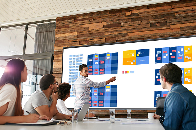 Por su parte, la pantalla no táctil de la serie L de 105 pulgadas brinda una mayor sensación de conexión con los participantes remotos, maximizando el tamaño del contenido de la reunión, la cantidad de aplicaciones que se pueden mostrar simultáneamente y la cantidad de participantes que se pueden ver a la vez.