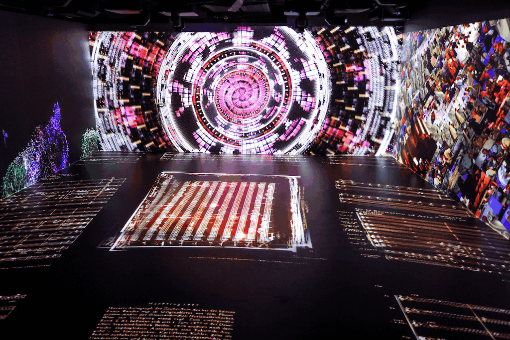 Para la última sala de la exposición, el artista de nuevos medios Refik Anadol ha utilizado la tecnología de inteligencia artificial y millones de puntos de datos para crear La Flauta mágica – Mozart para siempre, un evocador mundo de imágenes fantásticas.