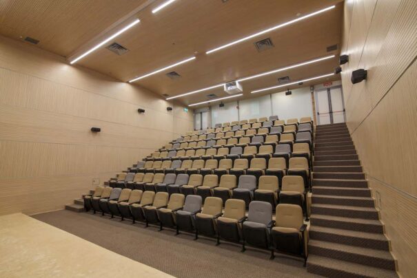 La zona de la gradería cuenta con ocho altavoces RoomMatch Utility RMU105 para generar el efecto surround para el sonido de las películas, que se ofrecen en resolución 4K Ultra HD a través de un proyector de Christie.