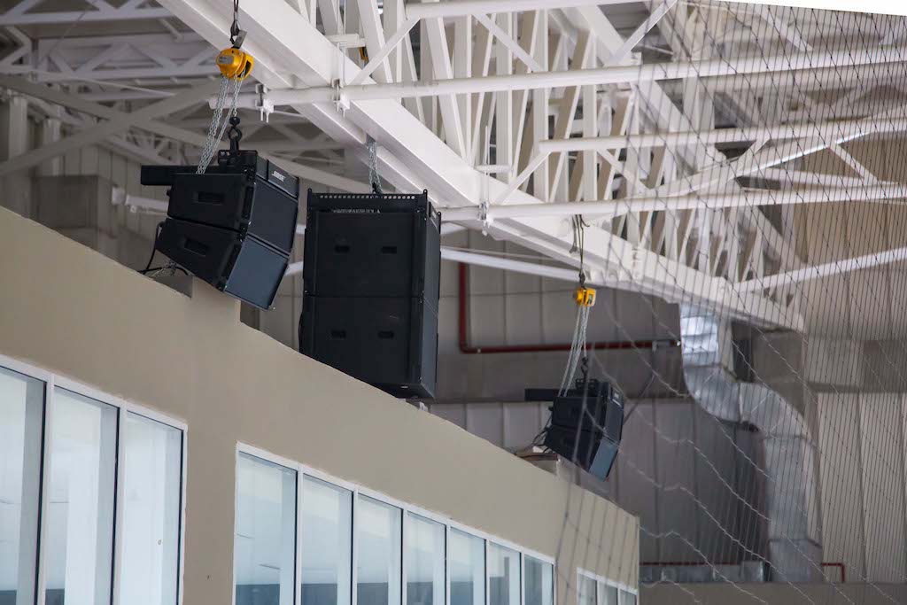 Con la ayuda del equipo de Automa, distribuidor local de Bose Professional, y el ingeniero de soporte de este fabricante en Latinoamérica, Tecnoprocesos diseñó un sistema de audio con altavoces de arreglo lineal ShowMatch DeltaQ, suspendidos del techo del gimnasio.