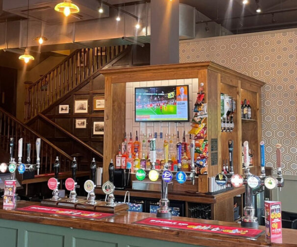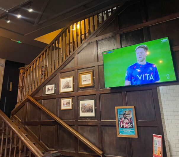 En la planta baja, la atención es captada por una amplia gama de equipos Led Samsung Hospitality 4K. Con seis equipos de 32 y 65 pulgadas, estas pantallas comerciales están diseñadas teniendo en cuenta los requisitos tanto del cliente como del propietario del pub.