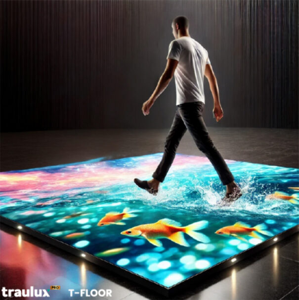 Las pantallas de Led de suelo T-floor de Traulux transforman una sala inerte, en un lugar lleno de vida capaz de generar emociones, haciendo que cada paso que se dé sobre ellas sea un momento para recordar.