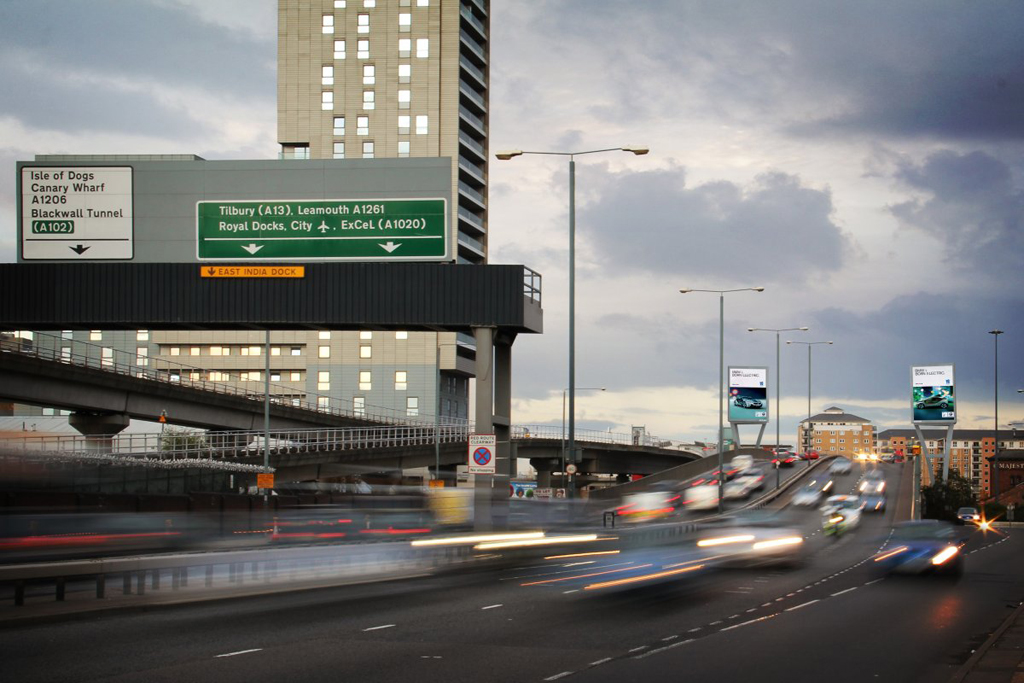 海洋户外 在东伦敦设置了两个巨大的户外数字广告屏幕. 结构, 受洗为“东双塔”, 显示宝马汽车品牌的广告, 它们位于通往金丝雀码头的高速公路上, 伦敦金融城和伦敦机场, 吸引在英国首都金融区工作的员工的注意力. 它们是“西双塔”的精确复制品, 从希思罗机场到伦敦西区的路上有一个类似的设施.
