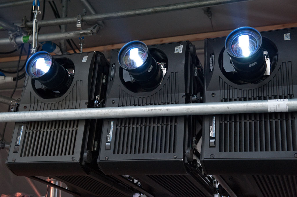 La ejecución técnica del componente visual del espectáculo correspondió a ETC, una empresa reconocida por cómo ha sabido aplicar su rica experiencia en video mapping a proyecciones videográficas de gran escala. El equipo de ETC recurrió esta vez también a la potencia de intensidad de los proyectores 克里斯蒂 3-芯片DLP, poniendo sobre el terreno un total de 81 proyectores para el Alfa-Show 4D: todo un récord en la actual industria del video mapping. Quince proyectores Christie Roadie HD+30K con una intensidad de flujo lumínico de 30.000 ANSI 流明, y 66 proyectores Christie Roadster S+20K de 20.000 lúmenes ANSI de intensidad, cubrieron toda la fachada, incluyendo sus superficies laterales. Los proyectores se dividieron en varios grupos, instalándose en unas torres construidas ex profeso para la ocasión y montándose a diversas distancias y ángulos a lo largo de los flancos del edificio principal, sobre la cubierta del pórtico central y en la sala de equipo central ubicada en la torre más alta, a unos seis metros por encima de los palcos VIP.