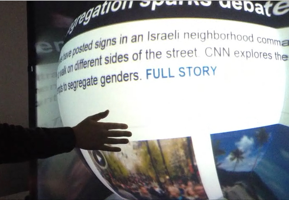 La tecnología multi-táctil capacitiva desarrollada por Displax está disponible como una película de polímero transparente y flexible que se puede aplicar a las superficies planas no conductoras, dándoles capacidades multi-táctiles. El contenido se muestra mediante un proyector y una lente “ojo de pez” especial para adaptar la proyección a la superficie esférica.