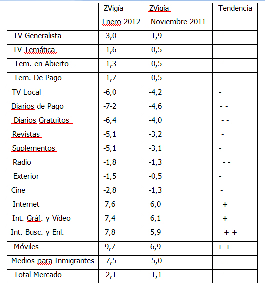 El estudio Zenith Vigía elaborado por Eduardo Madinaveitia estima que el mercado publicitario en su conjunto podría volver a caer un 2,1% 今年, completando el cuarto año de caídas en el último lustro, con la única excepción de la leve recuperación de 2010. Tras un final de año muy negativo, los recortes en la economía han traído de nuevo el pesimismo al sector. La inversión publicitaria podría retroceder hasta cifras que no se veían desde finales de los años noventa. Para algunos medios, como los diarios y las revistas el volumen del mercado ha retrocedido hasta valores de hace más de veinte años.