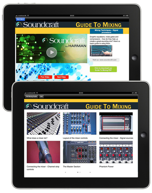 “The Soundcraft Guide to Mixing” está hecho a medida para iPad. Usa los mismos videoclips que han generado más de 350.000 visitas sólo en Youtube. La guía acompaña a los usuarios dentro de todos los aspectos de la configuración y del uso de un mezclador de audio audio: explica los distintos controles y funciones, las conexiones de micros, los efectos de instrumentos, las técnicas básicas y avanzadas de mezcla, el uso de mezcladores para grabaciones en directo y