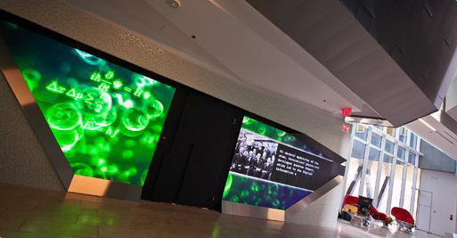 位于滑铁卢周界理论物理研究所的史蒂芬霍金中心, 安大略省 (加拿大), 八十四个 MicroTiles 克里斯蒂 están comunicando visualmente una serie de mensajes relacionados con la investigación, 针对不同受众的培训和外展工作, 包括一些世界上最伟大的思想家. 放置在中心大厅的一组 MicroTiles, 它本身已经是角度和多个视角的组合, 代表一个不规则的六边形,创建了一个动态的媒体墙,欢迎和通知访客.
