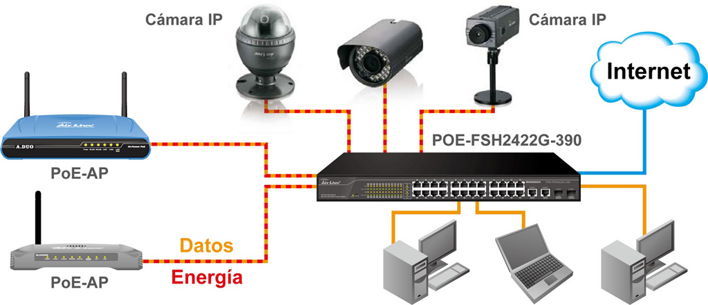 Potentes y prácticos, los nuevos switches POE-FSH2422G-250 y POE-FSH2422G-390 de 空中直播 poseen la energía necesaria (hasta 15.4W por puerto PoE, Power over Ethernet) para alimentar dispositivos PoE tales como APs, teléfonos IP o cámaras IP, entre otros equipos. Debido a estas características simplifican la instalación de la red y son ideales para implementar soluciones de vigilancia IP, puesto que permiten conectar cualquier tipo de cámara IP sin importar su consumo.
