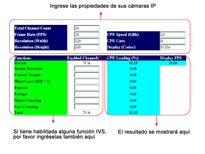 最后, la calculadora entregará como resultado cuántos recursos de hardware consumirá del servidor la aplicación de videovigilancia elegida. Este dato es muy útil para saber de antemano qué tipo de servidor se deberá incorporar en el proyecto. 例如, cuántos cuadros por segundo (帧率) pueden obtenerse si se configura CamPro Professional con 16 x OD-325HD.