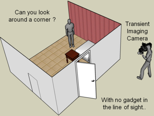 Los científicos del MIT Media Lab han construido una cámara que puede ver los objetos situados a la vuelta de la esquina y más allá de la línea de visión mediante la reconstrucción del elemento oculto usando luz láser dispersa. La cámara utiliza la luz que viaja desde el objeto a la cámara de forma indirecta, mediante la reflexión de las paredes u otros obstáculos, para reconstruir la forma en 3D.