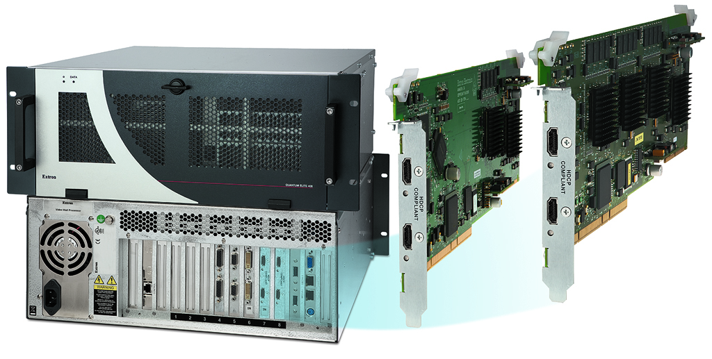 Extron 电子 ha sacado al mercado las tarjetas de entrada y salida HDMI que agregan conectividad HDMI y compatibilidad HDCP con el Sistema de Procesamiento de Videowall Extron Quantum Elite. Estas tarjetas permiten la presentación de discos Blu-ray Disc, satélite digital o cable, y otras fuentes cifradas con HDCP en pantallas compatibles con HDCP. Las tarjetas de entrada HDMI Quantum aceptan dos entradas HDMI a resoluciones de hasta 1920×1200 y 1080p/60 HDTV. Las tarjetas de salida HDMI Quantum incluyen dos salidas HDMI para la conducción de dos pantallas de videowall con resoluciones de hasta 1920×1200 y 1080p/60 HDTV , y muestran hasta 128 ventanas por tarjeta de salida. Las tarjetas de entrada y de salida cuentan con la tecnología de escala de alto rendimiento para optimizar el procesamiento de imágenes en tiempo real y para garantizar una presentación de imagen de alta calidad en las pantallas de videowall. El procesador de videowall Quantum Connect también está disponible en configuraciones de sistemas compatibles con HDCP.