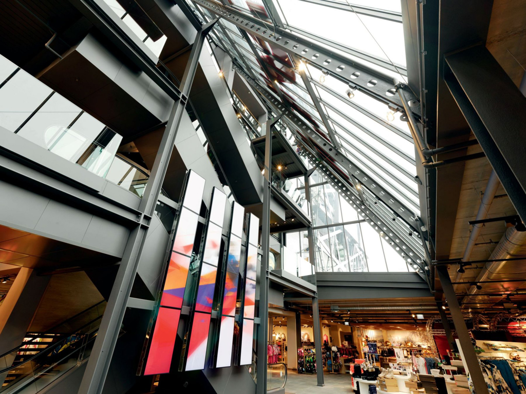La nueva tienda de Intersport Eybl se inspira en el Estadio Olímpico de Beijing, incorporando ligereza y transparencia, con formas y colores dinámicos que representan el éxito de Eybl a través del espíritu deportivo y la innovación. Para atraer e inspirar a los clientes dentro del área de cuatro niveles de ventas, Intersport Eybl encargó a Lackner Mediasystems la creación de cuatro videowalls. Uno de ellos está situado en el centro de la zona de entrada, y consta de 4×4 显示德 46 英寸, que destaca como el principal punto visual. Otro punto de atracción es el display wall en el área de pantalones, que utiliza pantallas de orientación vertical y horizontal en una combinación que crea una atrayente presentación poco convencional. 除了, otros dos displays walls, cada uno con dos pantallas, se utilizan en otras áreas temáticas.