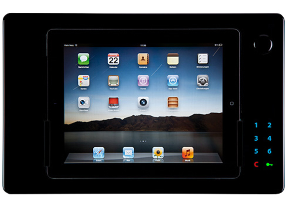从 IHS se ofrece la solución de iRoom iDock“触摸码”, que permite dejar el iPad localizado en todo momento en una base cargadora de pared, la cual deja bloqueada la extracción del dispositivo móvil hasta que se introduzca un código de seguridad que previamente se haya memorizado a elección. Mientras está en el soporte de pared, el equipo se está cargando, se puede utilizar como fuente de audio para el sistema multiroom y se puede interactuar con él con completa normalidad. Cuando sea necesario, es posible recuperar el iPad introduciendo la clave y así disfrutar de todas las ventajas de un dispositivo inalámbrico.