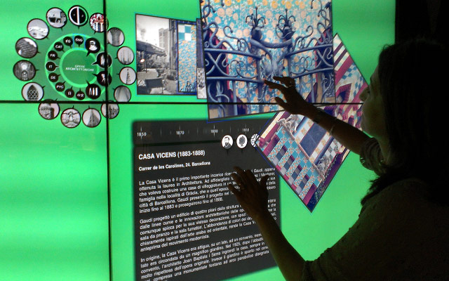 Antes de experimentar el audiovisual, los visitantes pueden también acceder a toda la vida y obra de Gaudí a través de tres muros interactivos -uno de 6×1,5 metros y dos de 3,80 x 1,5 地铁- que funcionan como grandes tabletas táctiles permitiendo la interactividad de varios usuarios.