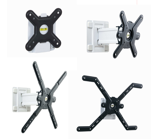 Esta nueva serie de soportes de pared desarrollados por Erard Pro están dirigidos a ofrecer una instalación simple y eficiente de distintos tipos de pantalla, así como una gran adaptabilidad a diferentes tipos de instalaciones. Además de sus tres tipos de instalación: fija, inclinable e inclinable/giratoria, 提供 4 tamaños que soportan desde Vesa 75×75 a 600×400. Cuando son ensambladas, la parte plateada (lado de la pared) y la parte de color negra (lado de la pantalla) son sujetadas con un tornillo que evita que la pantalla se caiga. El visor de nivel integrado y la simplicidad del sistema de bloqueo facilitan la instalación de cualquier tipo de pantalla.