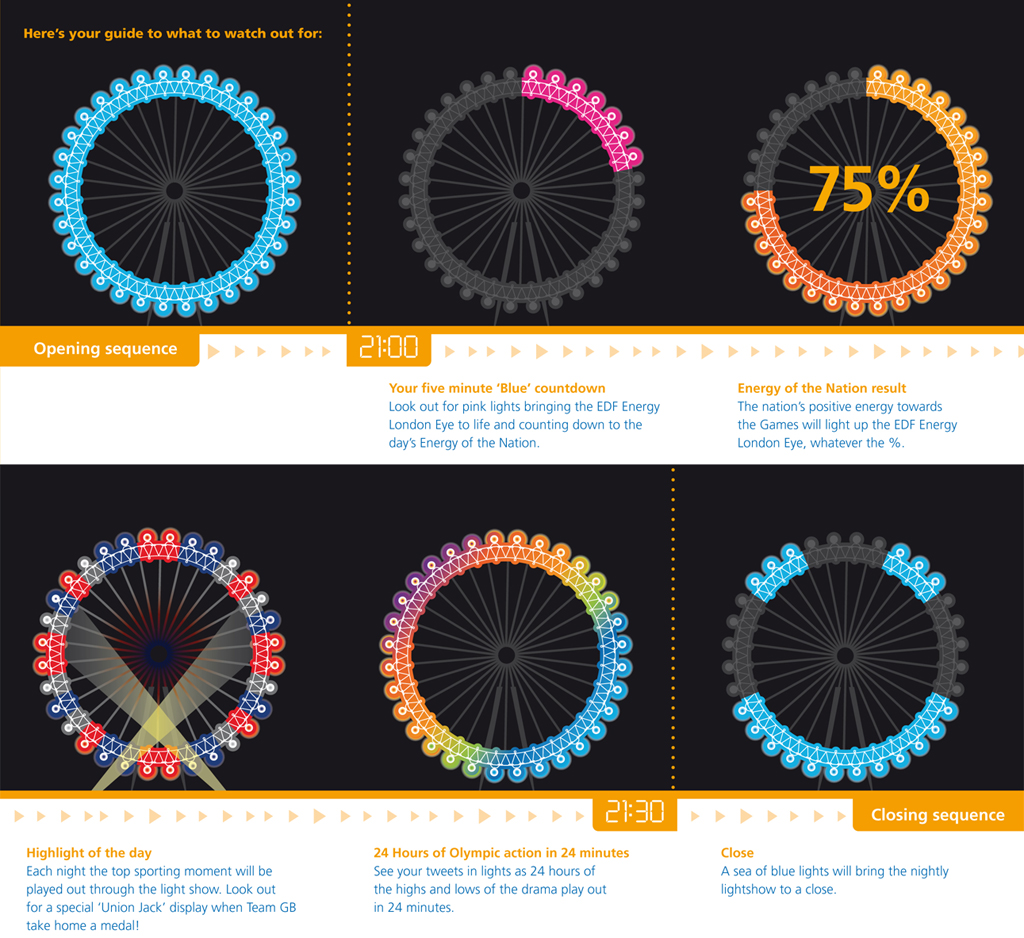 #Energy2012 es el ‘hashtag’ desde el cual se anima a participar a los usuarios de Twitter en esta iniciativa. A través de un “seguimiento del sentimiento social” en tiempo real se conseguirá dividir los ‘tuits’ en positivos y en negativos gracias a un programa que los clasifica y más tarde los convierte en un espectáculo de luces. Un ejemplo sería que, si la energía de la nación fuera del 75 por ciento positivo, tres cuartas partes de la rueda se iluminarán.”Queremos hacer de la EDF Energy London Eye una espectacular muestra de apoyo nacional para los atletas y algo que le inspire cada día durante los Juegos Olímpicos”, ha afirmado Thompson.