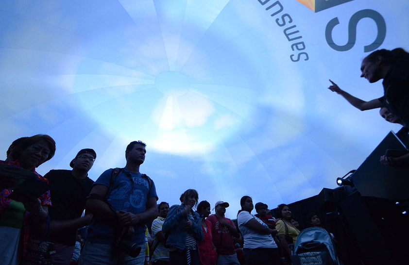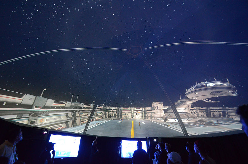 定制内容由 Monster Media 为三星开发,用于推广其新系列智能电视, 作为体验的一部分,它们被用于整个圆顶周边, 充当用户级太空运输控制面板,显示飞行详细信息和新的语音激活控制. 从圆顶可以看到中殿的窗户, 星星在哪里, 小行星, 行星和空间站以令人印象深刻的 3D 方式移动.