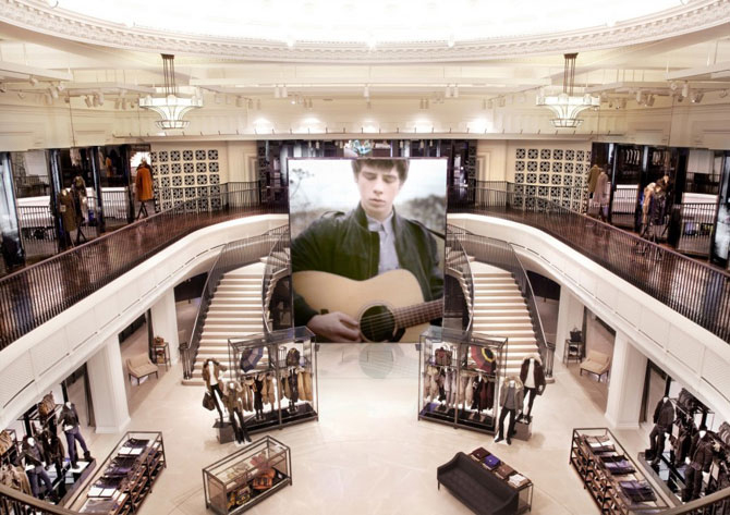 Después de dos años de una minuciosa restauración y más de 300.000 horas de trabajo se ha conseguido recuperar la belleza interior de un edificio construido en 1820 que ofrece un nuevo concepto futurista de compra. Una gran pantalla digital (de siete metros de altura) -la más grande del mundo dentro de una tienda-, en la que continuamente se mostrarán las colecciones de la marca, comparte espacio con más de 100 pantallas de video repartidas por toda la tienda que emitirán contenido en streaming, espejos que mutarán en pantallas y proyectarán desfiles, aplicaciones para soportes interactivos y 500 altavoces con sonido envolvente.
