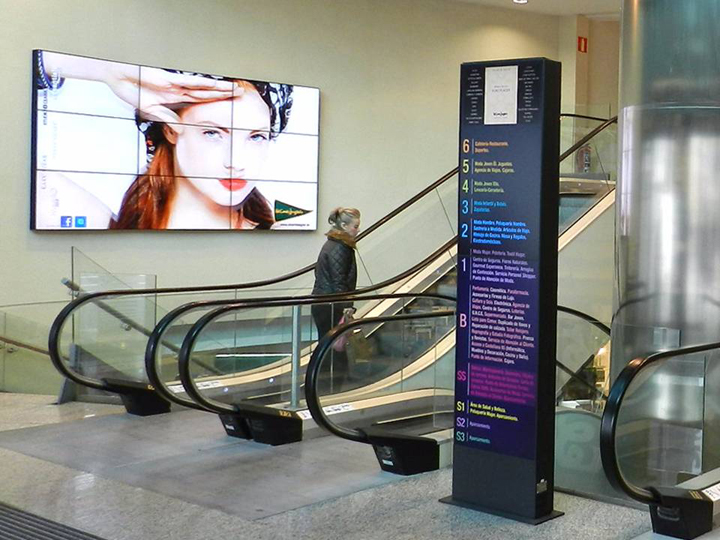 · Pantallas super panorámicas horizontales de 43” (relación de aspecto 16×5), para las que se ha dispuesto un mueble integrador que recoge dos pantallas opuestas (una por cada cara) y un reproductor que da servicio a ambas. Un soporte tubular telescópico permite colgar el mueble del techo. Se disponen a lo largo de los pasillos y en las salidas de escaleras. Su función principal es la orientación de los clientes en sus recorridos por la planta.