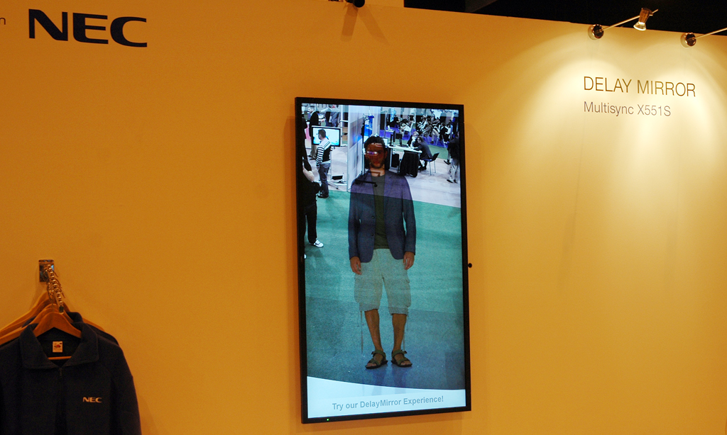此外, NEC está exhibiendo otro innovador producto retail: el Delay Mirror, desarrollado junto con la empresa 康琪 sobre una pantalla Multisync 551S. Se trata de un ‘video-espejo’ que proporciona una fuente continua de vídeo con retardo que permite a los compradores verse como eran tres segundos antes. Esto posibilita que el comprador se dé la vuelta frente al espejo del probador y pueda ver la ropa que lleva puesta desde todos los ángulos, proporcionándole una original manera de probarse las prendas así como una divertida experiencia de compra que no podría conseguir vía online o a través de cualquier otro medio.