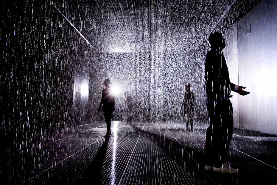 《雨室》, 项目名称, 由一个房间组成 100 平方米,配备运动传感器和 3D 摄像头,通过检测人员来阻止雨. 一切都在一个系统中进行 “印象” 水, 仅在房间内被占用的地方停止生产. 这个奇特的装置是由艺术工作室创作的 兰登国际 并使用关于 1.000 每分钟升水, 掉落后立即过滤并重复使用.