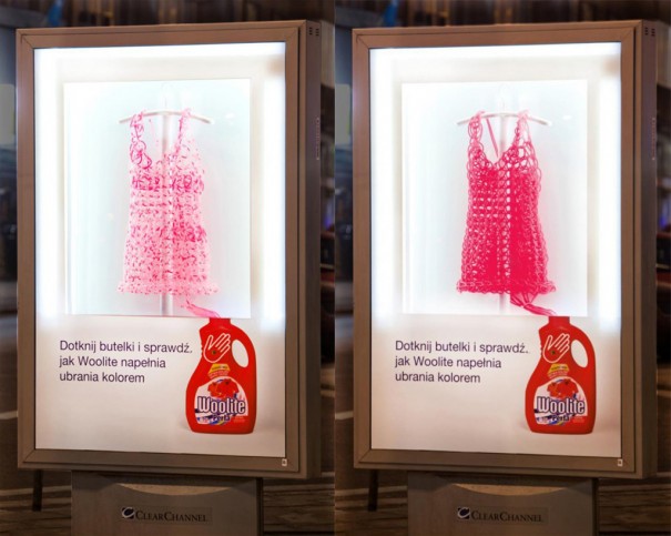 洗涤剂品牌 Woolite 承诺“恢复衣服的颜色”. 为了证明这个公理是正确的, 广告公司 欧洲 RSCG 华沙 安装了低保真互动屏幕,以便路人可以参与行动并亲眼目睹承诺是真的. 屏幕里面是一套完全由 200 米长的小透明管, 从 Woolite 容器中出来并最终放入套装中. 路人, 按一个按钮, 他们建立了一个系统,红色液体通过这些管子流动, 给人一种衣服因洗涤剂的作用而恢复颜色的感觉.