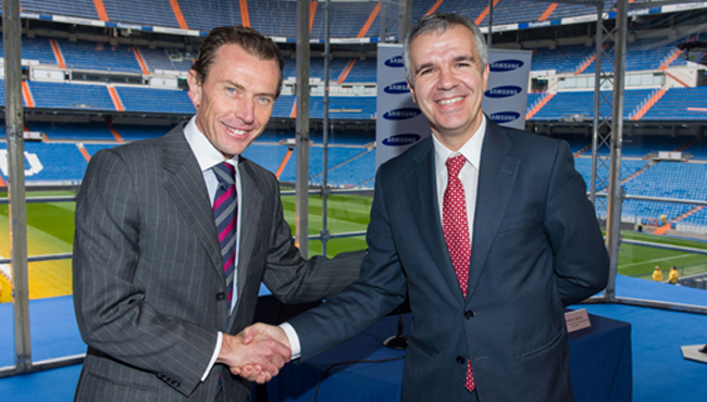 Emilio Butragueño, director de Relaciones Institucionales del Real Madrid, y Celestino García, vicepresidente de la División de Telecomunicaciones de Samsung Electronics