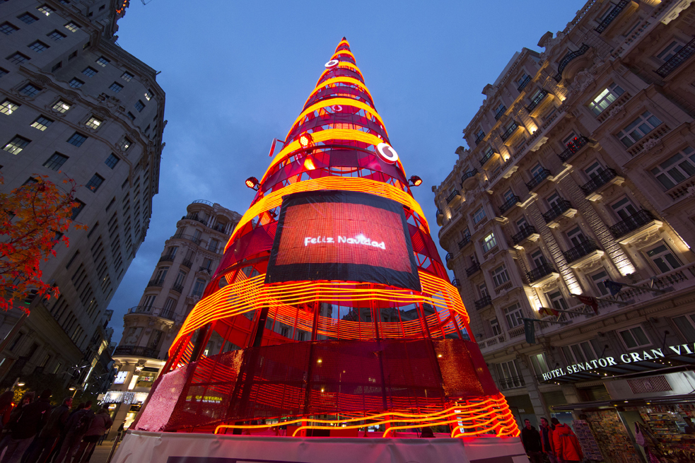 Durante estas fiestas, todos los que paseen por la madrileña Gran Vía, a la altura del número 28, podrán contemplar un nuevo elemento que llama mucho la atención. Se trata de un majestuoso abeto rojo que Vodafone y el Ayuntamiento han ubicado en esta céntrica vía de la capital. El árbol incluye un par de pantallas gigantes desde la que es posible felicitar las Navidades mediante vídeos, imágenes o textos.