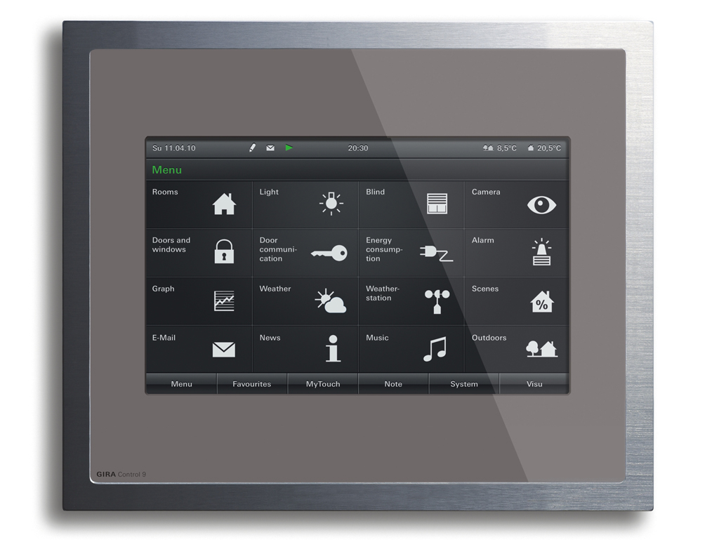 Utilizando estas dos pantallas táctiles, el usuario puede tener un ojo en el control de todo el edificio y mantenerlo bajo control, ya que pueden ser manejados de manera intuitiva con un solo dedo. La interfaz de Gira muestra las funciones individuales de forma clara y concisa y por lo tanto proporciona una buena visión de conjunto y de fácil acceso. Tocando suavemente la pantalla táctil TFT, se pueden realizar procesos tales como el cambio de luz, la regulación o el control de persianas, así como el ahorro y la recuperación de escenas de iluminación y escuchar música. La guía de menú es fácil de entender y permite el acceso rápido a las funciones deseadas en ambos dispositivos.