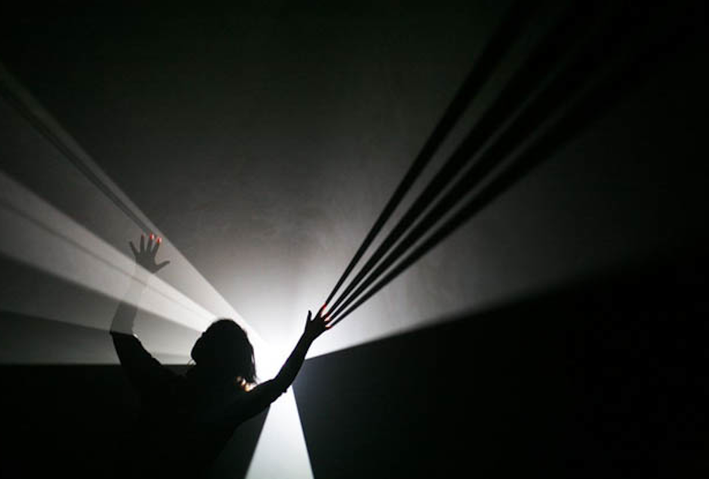 La sorprendente originalidad de esta exposición es que los visitantes pueden pasear entre las obras de este artista; un conjunto formado por siete escultura esculpidas con luz que se mueven muy lentamente en un espacio totalmente oscuro. Los visitante son conducidos a una silenciosa y oscura habitación en la que, 起初, sólo se percibe el olor dulzón que desprende una máquina de humo. En el centro de la habitación, dos pantallas de proyección cuelgan del techo con el objetivo de convertir en finas cadenas de luz blanca lo que se refleja en las pantallas situadas en ángulos opuestos del espacio, como si se lanzaran pedazos rotos de lo que parecen arcos parabólicos que, lentamente, se mueven y forman nuevas configuraciones.
