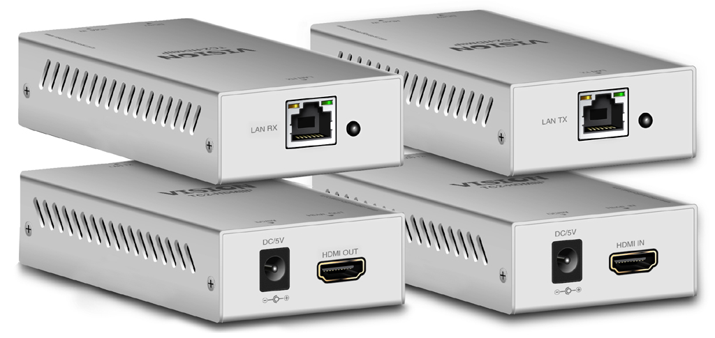 Esta solución de Vision convierte la señal HDMI, de hasta 1080P, en paquetes que son transmitidos a través de la red. La señal puede pasar a través de hasta tres conmutadores de red, sin restricciones en cuanto a longitud de cable, ya que los datos HDMI se dividen, para su transmisión, en paquetes TCP/IP. 这样, es posible llevar la señal a través de cualquier infraestructura Ethernet.