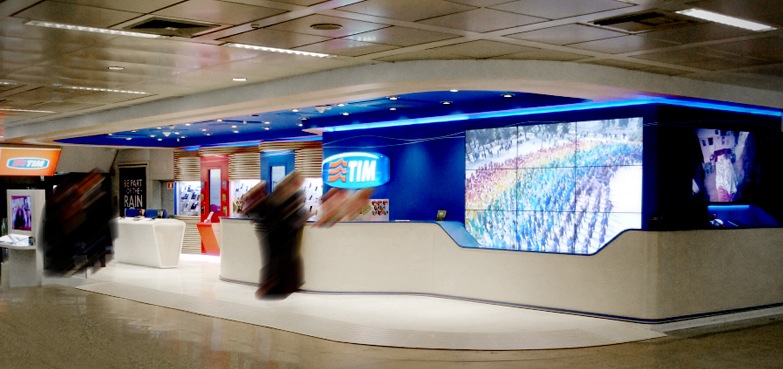 La tienda de Telecom Italia en el aeropuerto internacional de Roma es uno de los establecimientos insignia del operador, ya que por esta instalación transitan más de cuarenta millones de personas al año. 在这个空间里, diseñado como un atrio digital, lo clientes pueden disfrutar de contenidos de entretenimiento y canal TV, además de conocer las promociones y mensajes de la compañía.