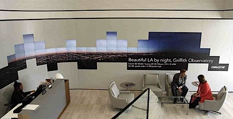 再一次, 科视Christie 在其总部之一使用自己的视频技术, 在这种情况下,加州柏树, para cubrir dos paredes del vestíbulo de entrada con 108 MicroTiles de 64 百万像素.