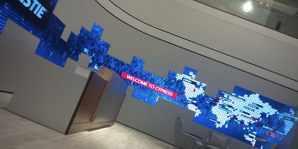 En esta ocasión se trata de la sede de California, en cuyo vestíbulo se recibe a partners, clientes y proveedores con una pantalla de vídeo masiva y dinámica que se extiende por dos paredes, combinando tecnología, 建筑与艺术设计.