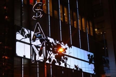 La obra se completa con tiras de Led verticales situadas por encima y debajo de las pantallas de vídeo, creando un muro de cortina con tecnología de Benson Industries (algo que tampoco ha confirmado su creador).