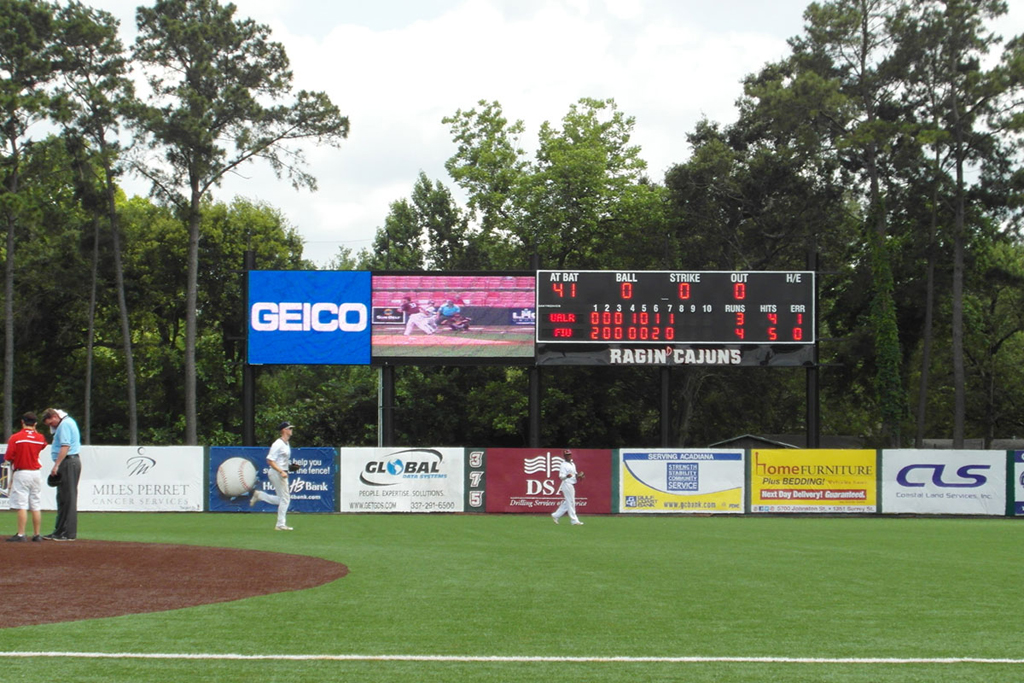Los seguidores del equipo de béisbol de los Ragin Cajuns disponen de una nueva pantalla y un videomarcador, suministrados por Daktronics, en su estadio de la Universidad de Luisiana.
