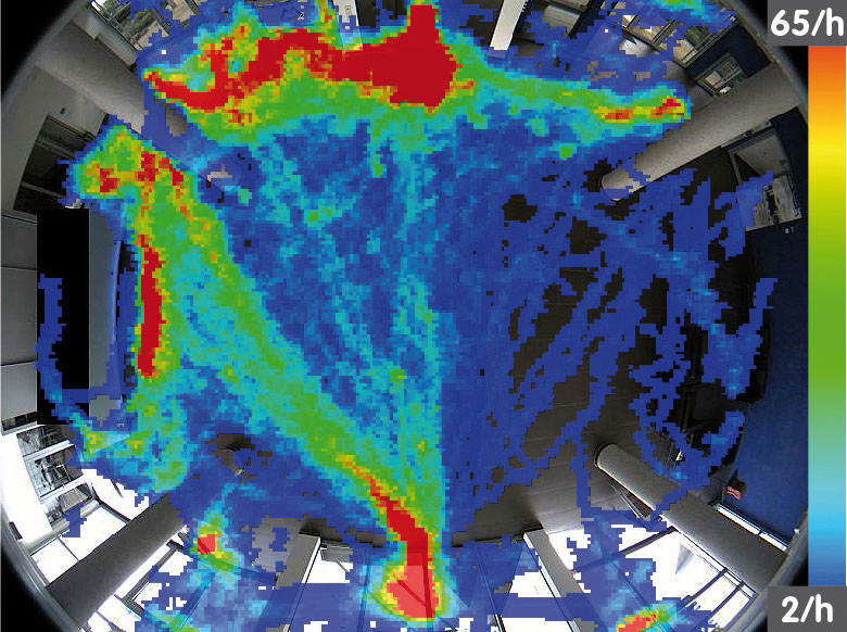 La tecnología MxAnalytics permite registrar y analizar con fiabilidad movimientos de personas u objetos en la imagen en vivo. En un mapa de calor (un diagrama de movimiento de un área determinada previamente), las zonas más frecuentadas aparecen marcadas con colores: las de color rojo son las que registran un gran número de movimientos, mientras que en las azules apenas se han producido.