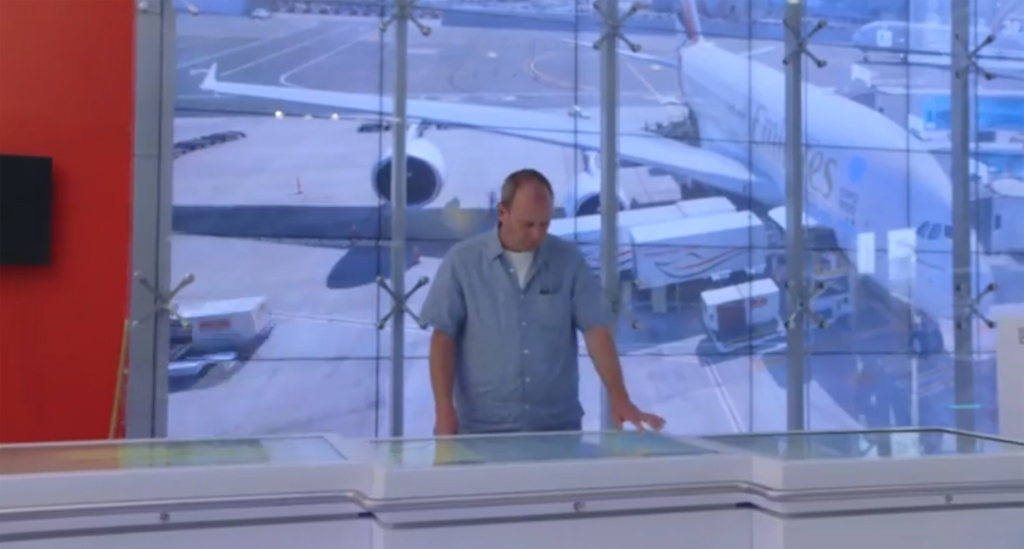 Utilizando su experiencia en pantallas holográficas, Engage Production proporcionó un sistema holográfico en el que se representa un Airbus A380 en pleno vuelo. 除了, también ha asesorado en los aspectos de los contenidos técnicos que son proporcionados por el reproductor 光明标志 HD220 y que se visualizan en una pantalla de 三星.
