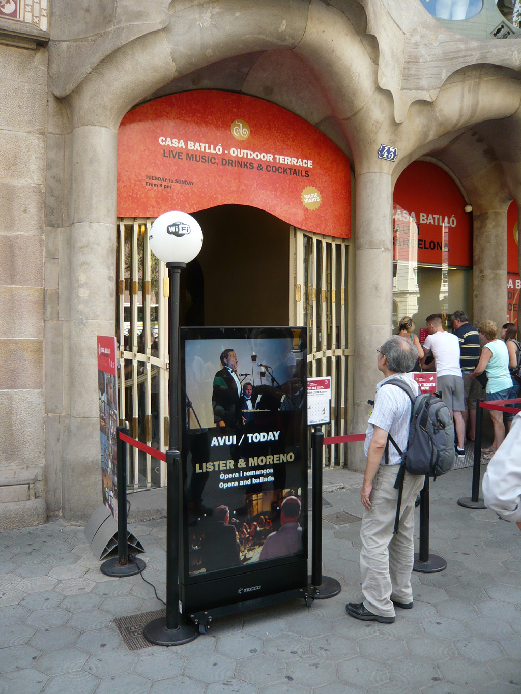 El tótem, que se encuentra ubicado en la entrada de este edificio modernista de Antoni Gaudí desde el pasado mes de agosto, consta de una pantalla vertical 锋利的 的 60 pulgadas con una luminosidad superior a 2.000 流明. Con una superficie de pantalla de más del 85% de su frontal, este equipo da respuesta a los requerimientos de luminosidad y funcionamiento en exterior que requería la Casa Batlló.